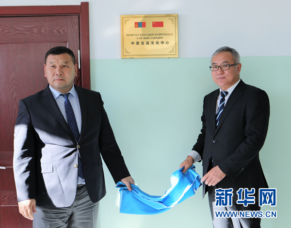 中國駐蒙古國大使館公使銜參贊楊慶東(右)和蒙古國中央省省長巴特扎爾格勒為“中蒙友誼文化中心”揭牌。 新華社記者 阿斯鋼攝