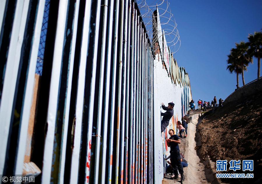 當地時間2018年12月8日,墨西哥提華納,中美洲“大篷車”移民滯留當地在邊境墻上涂鴉。(圖片來源:視覺中國)
