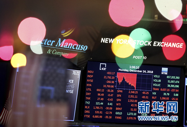12月24日,美國紐約證券交易所的電子屏顯示當日交易信息。 紐約股市三大股指24日收盤下跌。截至當天收盤,道瓊斯工業平均指數比前一交易日下跌653.17點,收于21792.20點,跌幅為2.91%。標準普爾500種股票指數下跌65.52點,收于2351.10點,跌幅為2.71%。納斯達克綜合指數下跌140.08點,收于6192.92點,跌幅為2.21%。 新華社記者 王迎 攝