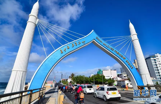 2018年10月2日,車輛從由中國援建、連接馬爾代夫首都馬累和機場島的中馬友誼大橋橋頭拱門穿過。新華社發(杜才良 攝)