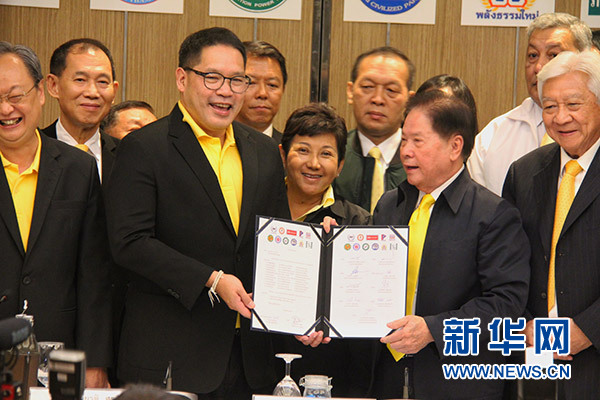5月13日,在泰國(guó)曼谷,泰國(guó)力量黨黨首三攀(中右)作為11黨代表向人民國(guó)家力量黨黨首烏達(dá)瑪(中左)提交支持意向書。 新華社記者 楊舟 攝