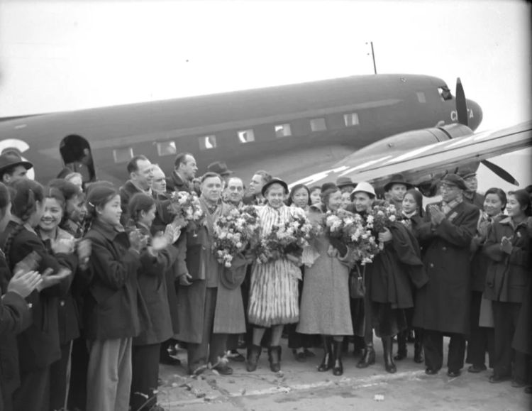 ↑應邀參加“中蘇友好月”的蘇聯電影藝術工作者代表團團長費道羅夫一行、蘇聯藝術工作團團員烏蘭諾娃等藝術家抵達北京,在機場受到中國文化界、電影界人士熱烈歡迎。(1952年11月6日,袁浩)