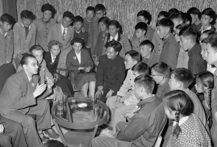 ↑共青團員們在上海舉行聯歡會,慶祝十月革命40周年。這是上海學生和蘇聯青年代表保爾·沙柯夫等交談。(1957年11月5日,楊溥濤)