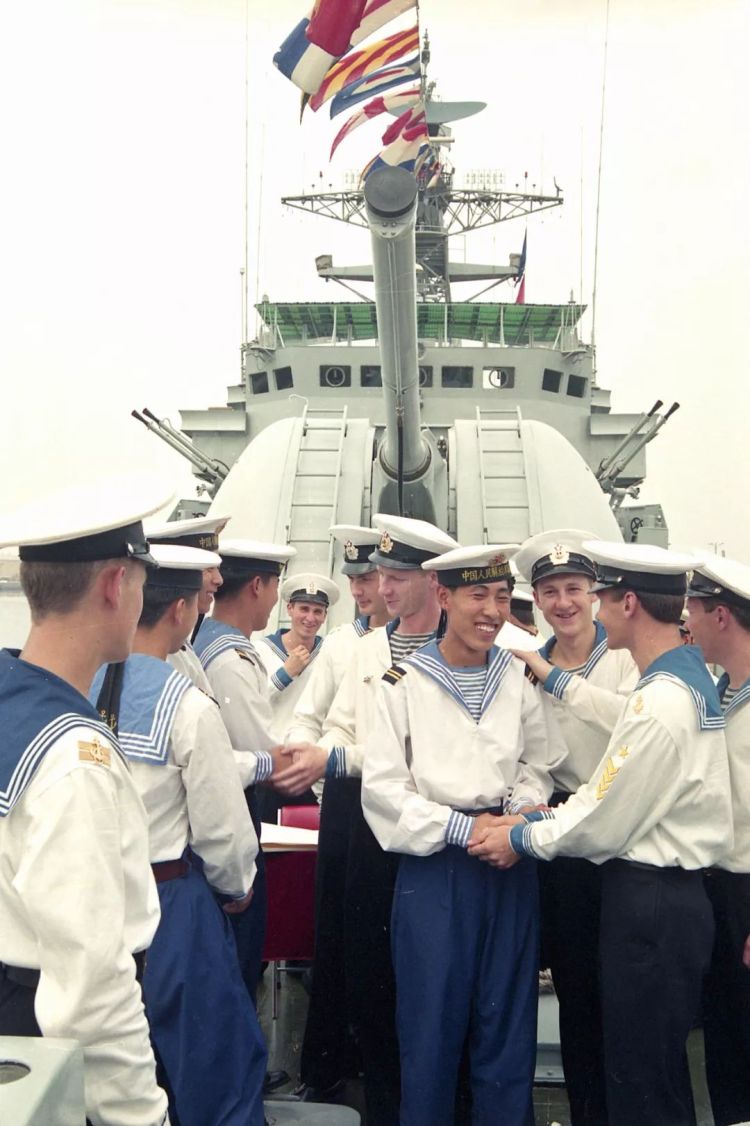 ↑正在山東青島進行友好訪問的俄羅斯海軍太平洋艦隊官兵,來到中國海軍艦艇參觀,受到中國水兵的熱情歡迎。(1993年8月26日,新華社稿)