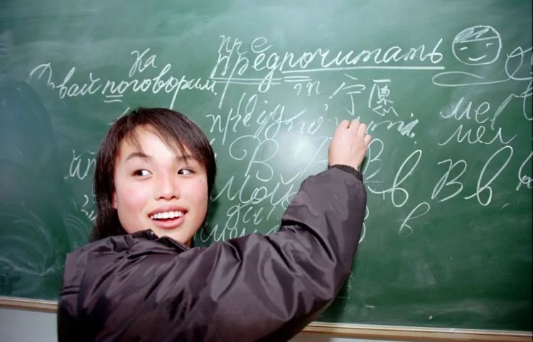 ↑中國滿洲里的一位老師在給學生上俄語課。 (2004年,葉夫格尼·葉潘欽采夫)