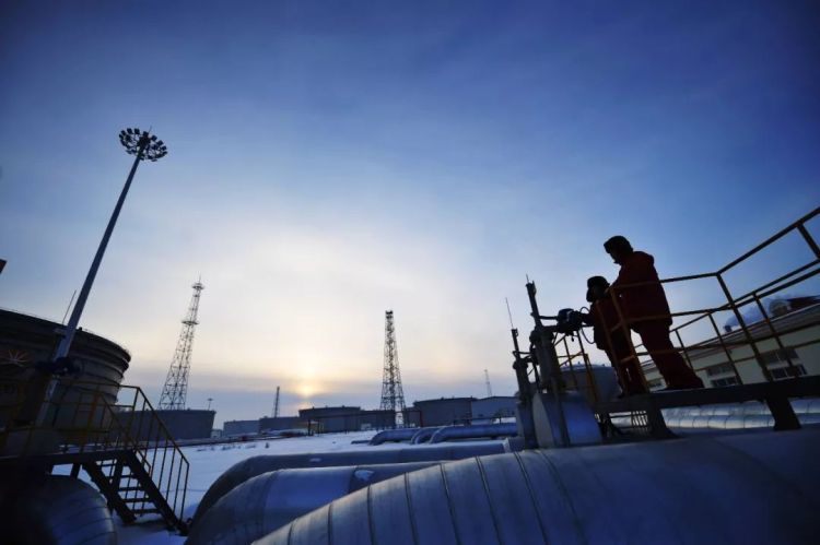 ↑黑龍江大慶,兩名工人在剛剛投產的中俄原油管道林源輸油站巡檢。(2011年1月10日,王建威)