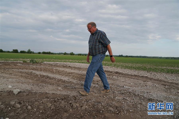 6月9日,在位于美國中部密蘇里州的小鎮(zhèn)奧里克,湯姆·沃特斯走在自己的農(nóng)田上。新華社記者 劉杰 攝