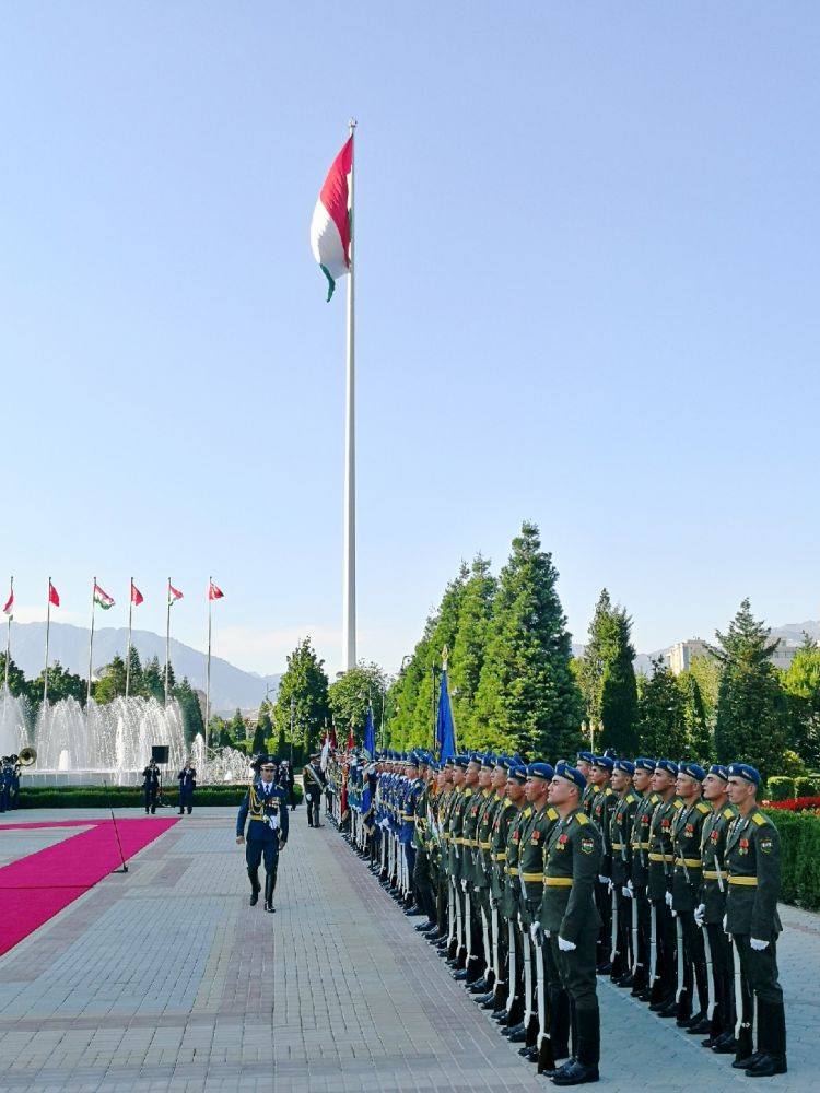 儀仗隊在塔吉克斯坦總統(tǒng)府列隊,等候兩國元首檢閱。遠處高聳的旗桿位于總統(tǒng)府外的國旗公園,高165米,是杜尚別的地標建筑之一。新華社記者 霍小光 攝