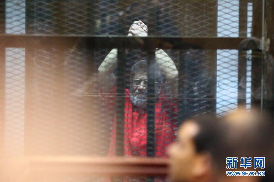 這是埃及前總統穆爾西在開羅一法庭接受庭審的資料照片(2016年6月18日攝)。埃及前總統穆爾西2019年6月17日在首都開羅去世,終年67歲。新華社發(艾哈邁德·戈馬攝)