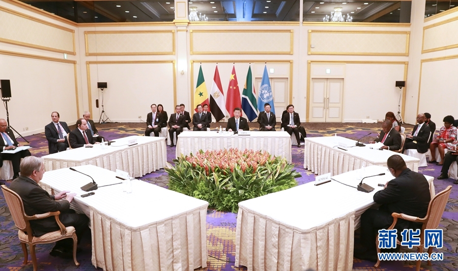 6月28日,國家主席習(xí)近平在大阪主持中非領(lǐng)導(dǎo)人會(huì)晤。中非合作論壇前任非方共同主席國南非總統(tǒng)拉馬福薩、非洲聯(lián)盟輪值主席國埃及總統(tǒng)塞西、中非合作論壇現(xiàn)任非方共同主席國塞內(nèi)加爾總統(tǒng)薩勒和聯(lián)合國秘書長(zhǎng)古特雷斯出席。 新華社記者 龐興雷 攝