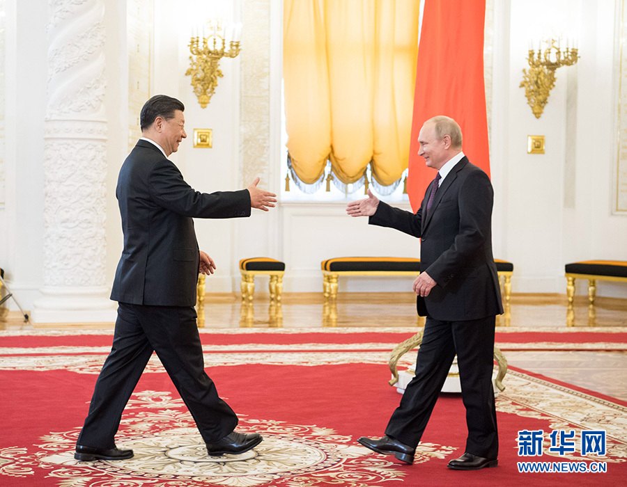 6月5日,克里姆林宮2層喬治大廳燈火通明。習近平主席和俄羅斯總統普京從數十米長的紅毯兩端相向走來。
