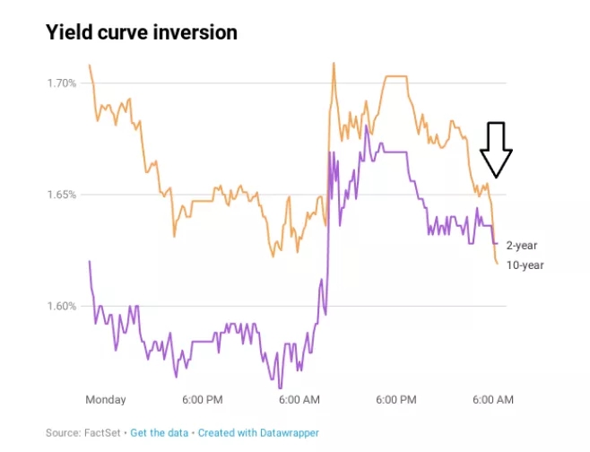 一般說來,國債期限越長收益率越高,因此短期國債收益率通常低于長期國債收益率;如果長期國債收益率降至短期國債收益率以下,這種反常現象被稱為收益率曲線“倒掛”,一般被視為經濟在未來12個月可能步入衰退的預警信號。上次出現這一現象時正值2007年美國次貸危機發酵。過去50年以來,美國歷次經濟衰退發生之前也都出現過國債收益率倒掛的現象。