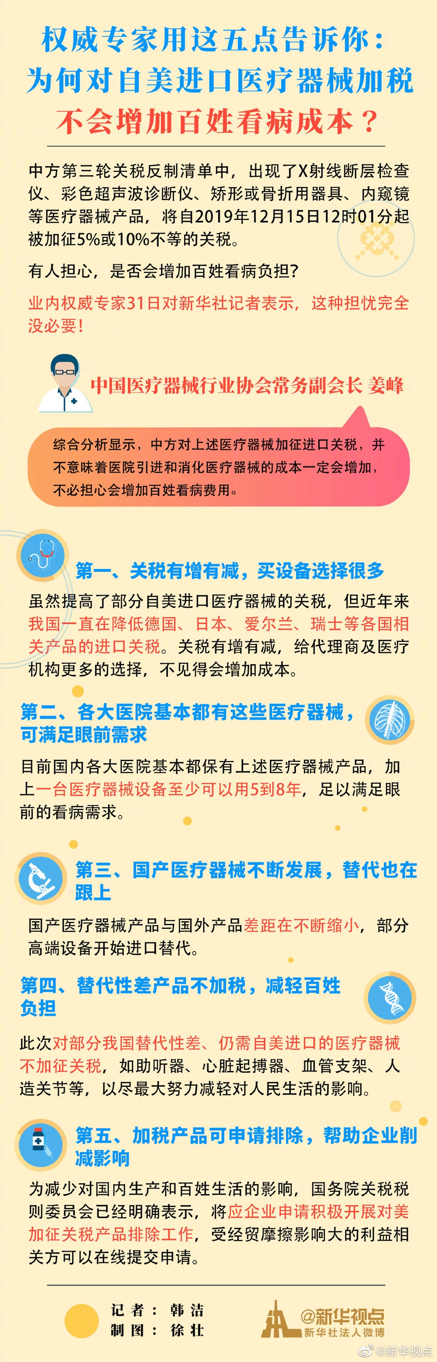 對此,中國醫療器械行業協會常務副會長姜峰31日接受記者采訪時說,綜合分析顯示,中方對上述醫療器械加征進口關稅,并不意味著醫院引進和消化醫療器械的成本一定會增加,不必擔心會增加百姓看病費用。