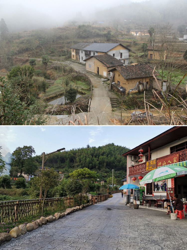 上圖:脫貧前的井岡山市神山村一角。攝于2016年1月;下圖:現在的井岡山市神山村一角。攝于2019年9月。(新華社發)