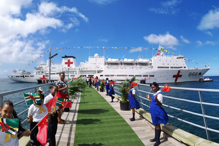 2018年10月12日,在多米尼克首都羅索,當地學生揮動多中兩國國旗歡迎中國海軍和平方舟醫院船首次到訪。(新華社發)
