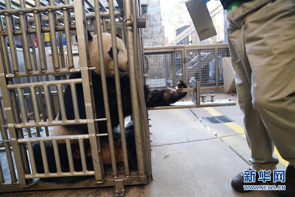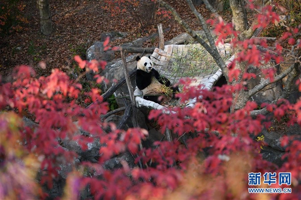 11月13日,在美國華盛頓的美國國家動物園,大熊貓“貝貝”接受體檢后到室外活動。新華社記者 劉杰 攝