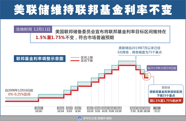新華社華盛頓12月11日電(記者楊承霖 高攀)美國聯邦儲備委員會11日宣布將聯邦基金利率目標區間維持在1.5%至1.75%不變,符合市場普遍預期。