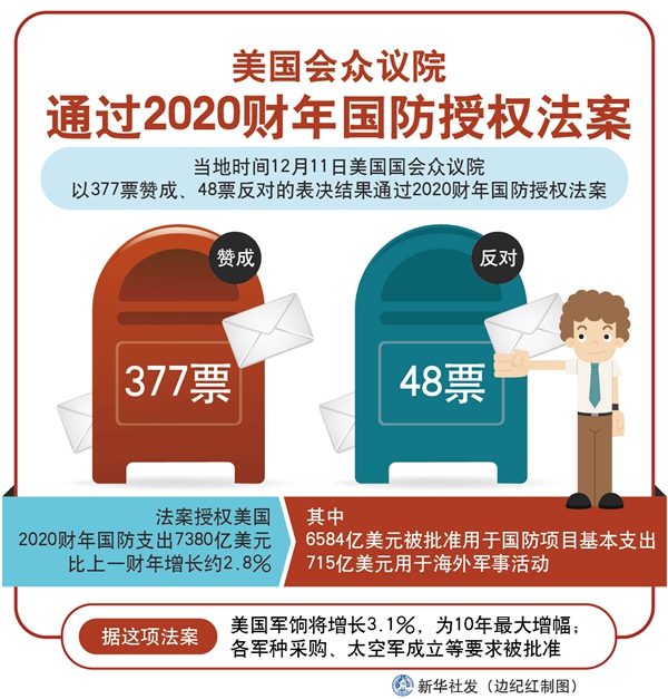 新華社華盛頓12月11日電(記者孫丁 徐劍梅)美國國會眾議院11日以377票贊成、48票反對的表決結果通過2020財年國防授權法案。