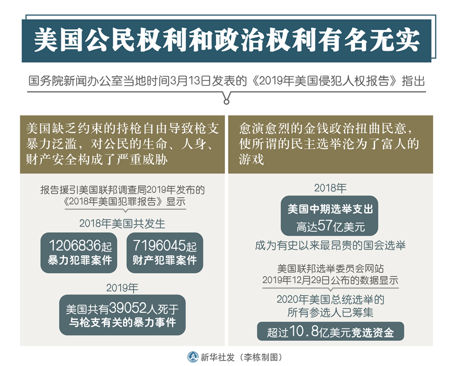 新華社北京3月13日電(記者王子銘、賈釗)國務(wù)院新聞辦公室13日發(fā)表的《2019年美國侵犯人權(quán)報告》指出,美國缺乏約束的持槍自由導(dǎo)致槍支暴力泛濫,對公民的生命、人身、財產(chǎn)安全構(gòu)成了嚴重威脅;愈演愈烈的金錢政治扭曲民意,使所謂的民主選舉淪為了富人的游戲。