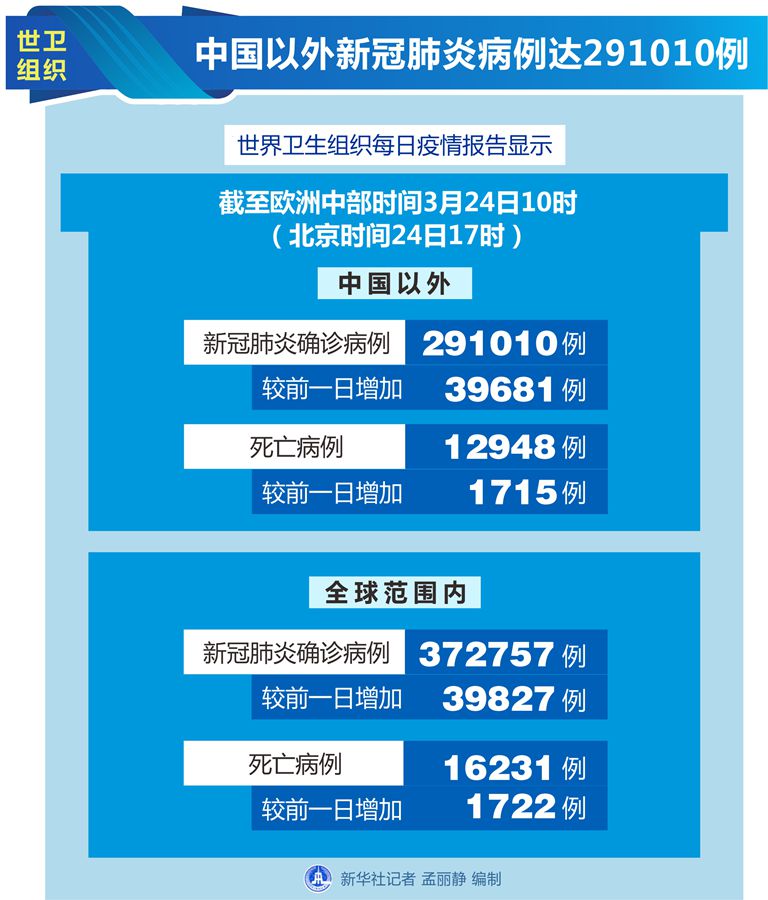 世衛(wèi)組織每日疫情報(bào)告顯示,截至歐洲中部時(shí)間24日10時(shí)(北京時(shí)間24日17時(shí)),中國(guó)以外新冠肺炎確診病例較前一日增加39681例,達(dá)到291010例;中國(guó)以外死亡病例較前一日增加1715例,達(dá)到12948例。