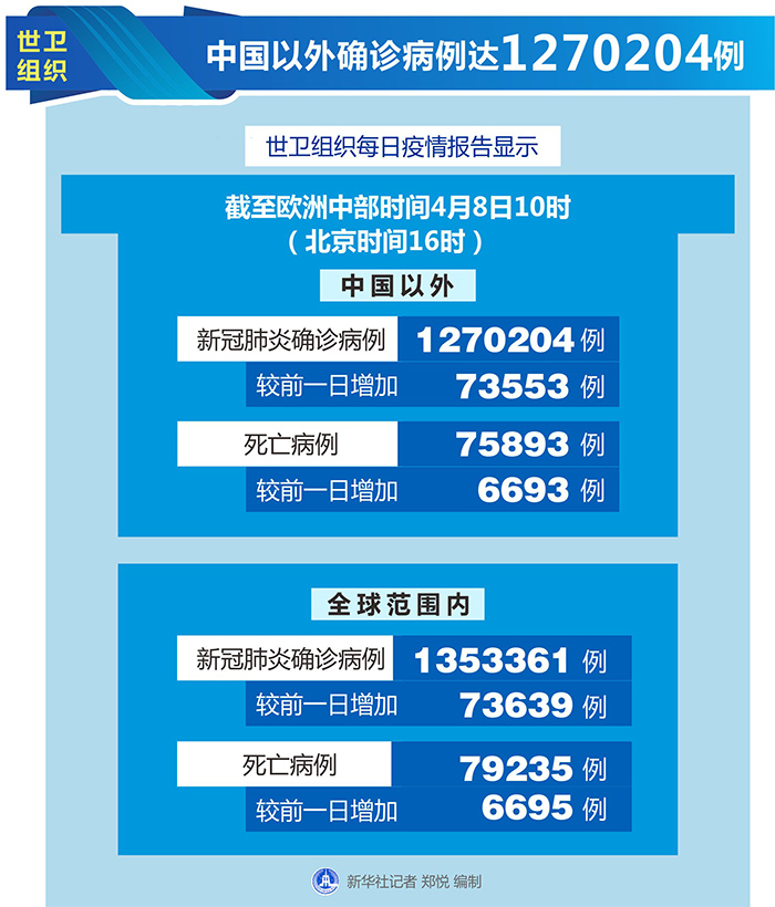 新華社日內瓦4月8日電(記者劉曲)世界衛生組織8日公布的最新數據顯示,中國以外新冠確診病例達到1270204例。