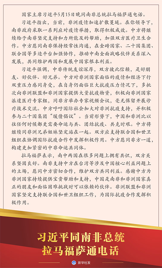 習近平指出,當前,非洲疫情加速擴散蔓延。在你領導下,南非政府采取一系列應對疫情舉措,取得積極成效。中方將繼續給予南非堅定支持和力所能及的幫助,加強雙方醫療衛生合作。中方愿同南非保持經常性溝通,在金磚國家、二十國集團、聯合國等多邊平臺加強協作,推動中南全面戰略伙伴關系深入發展,共同維護兩國和發展中國家根本利益。