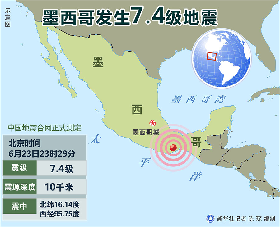新華社北京6月23日電 據(jù)中國地震臺(tái)網(wǎng)正式測定:6月23日23時(shí)29分在墨西哥(北緯16.14度,西經(jīng)95.75度)發(fā)生7.4級(jí)地震,震源深度10千米。