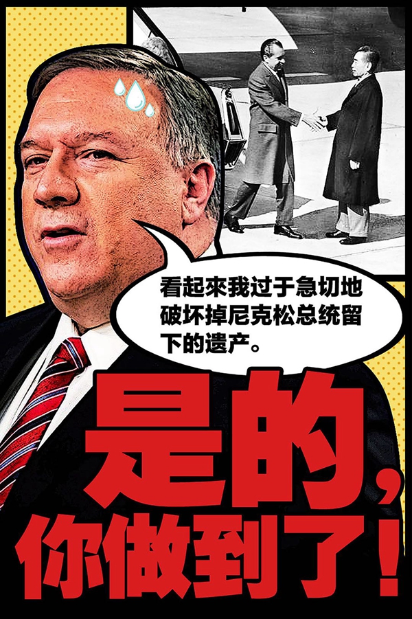 蓬佩奧選擇在“尼克松總統(tǒng)圖書館暨博物館”發(fā)表演說極具諷刺意味。中美近50年來的友好交往關(guān)系是兩國老一代領(lǐng)導(dǎo)人開創(chuàng)的,是對(duì)全世界的建設(shè)性貢獻(xiàn)。蓬佩奧作為中美關(guān)系的拆臺(tái)者,在此地演講不僅不配,而且是對(duì)尼克松總統(tǒng)的大不敬。