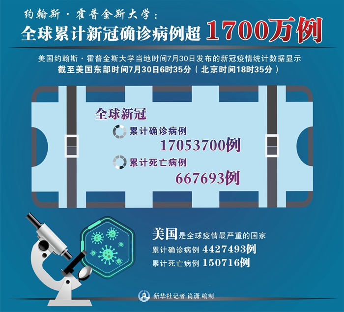新華社紐約7月30日電 美國約翰斯·霍普金斯大學(xué)30日發(fā)布的新冠疫情統(tǒng)計數(shù)據(jù)顯示,截至美國東部時間30日6時35分(北京時間18時35分),全球累計確診病例達到17053700例,累計死亡667693例。