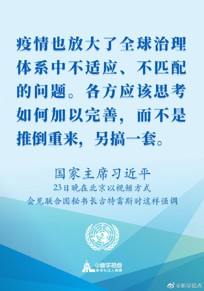 國(guó)家主席習(xí)近平23日晚在北京以視頻方式會(huì)見(jiàn)聯(lián)合國(guó)秘書長(zhǎng)古特雷斯時(shí)講話的金句