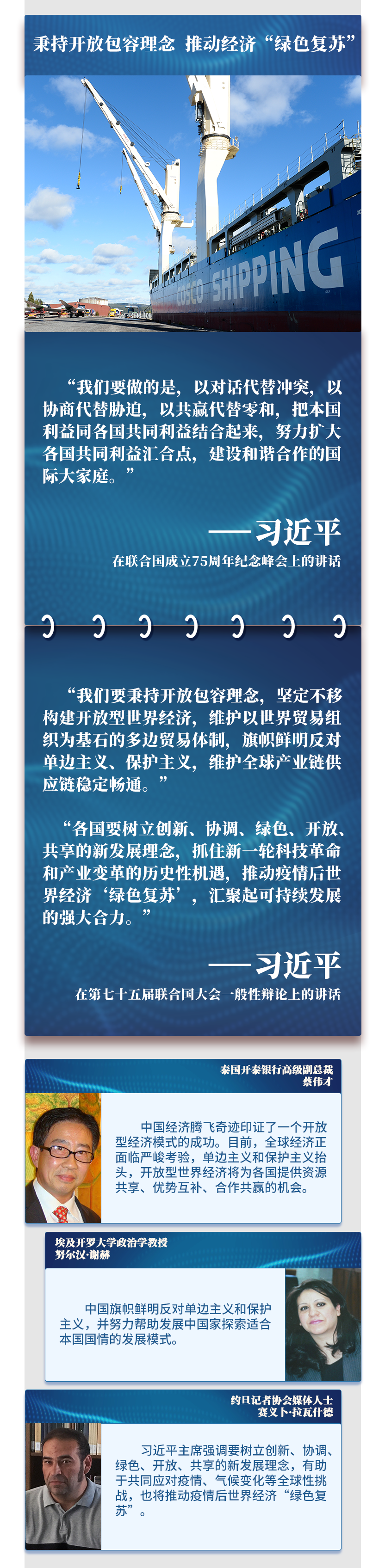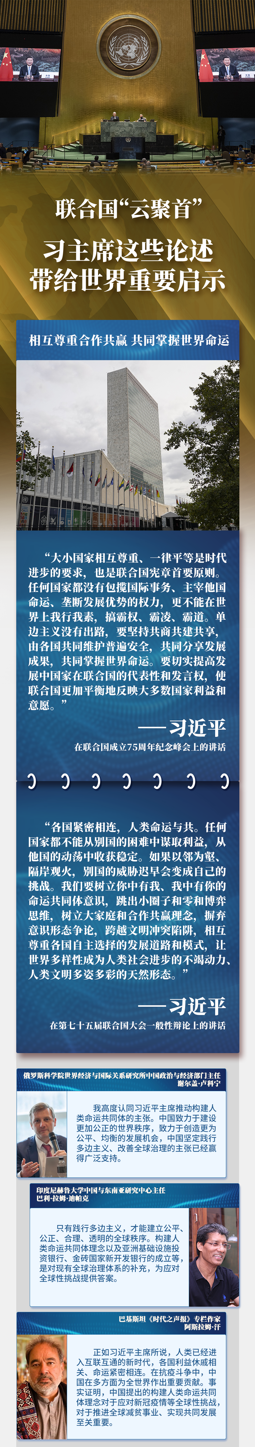 在聯合國成立75周年之際,習主席通過視頻方式,在聯合國這一多邊外交舞臺闡述關于國際秩序和人類前途命運的中國主張,為國際社會應對全球性挑戰、推動共同發展指明方向,為世界各國攜手構建人類命運共同體、共創更加美好的未來注入信心和動力——