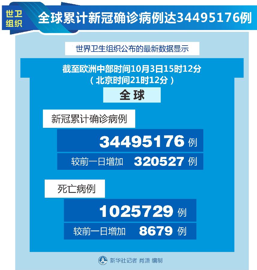 新華社日內(nèi)瓦10月3日電(記者劉曲)世界衛(wèi)生組織3日公布的最新數(shù)據(jù)顯示,全球累計(jì)新冠確診病例達(dá)34495176例。
