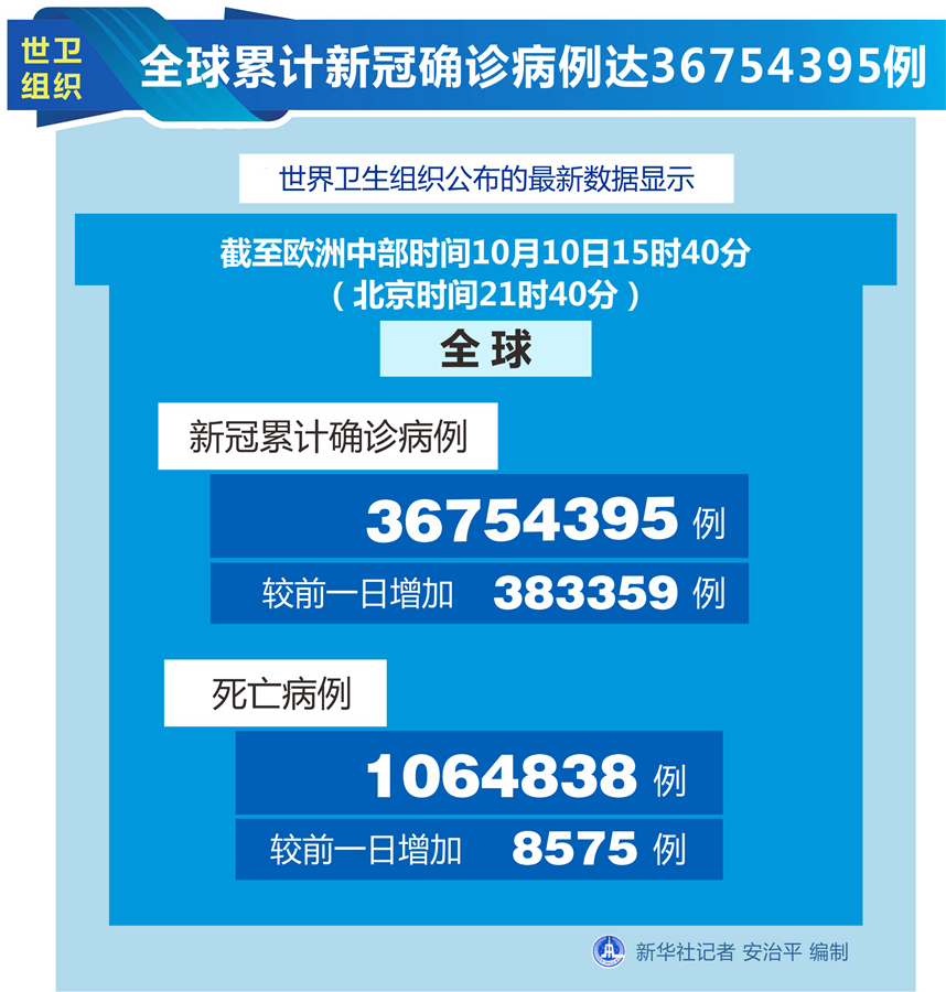 世衛組織網站最新數據顯示,截至歐洲中部時間10日15時40分(北京時間21時40分),全球確診病例較前一日增加383359例,達到36754395例;死亡病例增加8575例,達到1064838例。