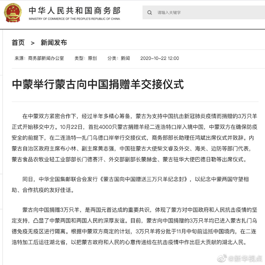10月22日,首批4000只蒙古國捐贈羊經二連浩特口岸入境中國,中蒙雙方在確保防疫安全的前提下,在二連浩特—扎門烏德口岸舉行交接儀式。詳情?? ????