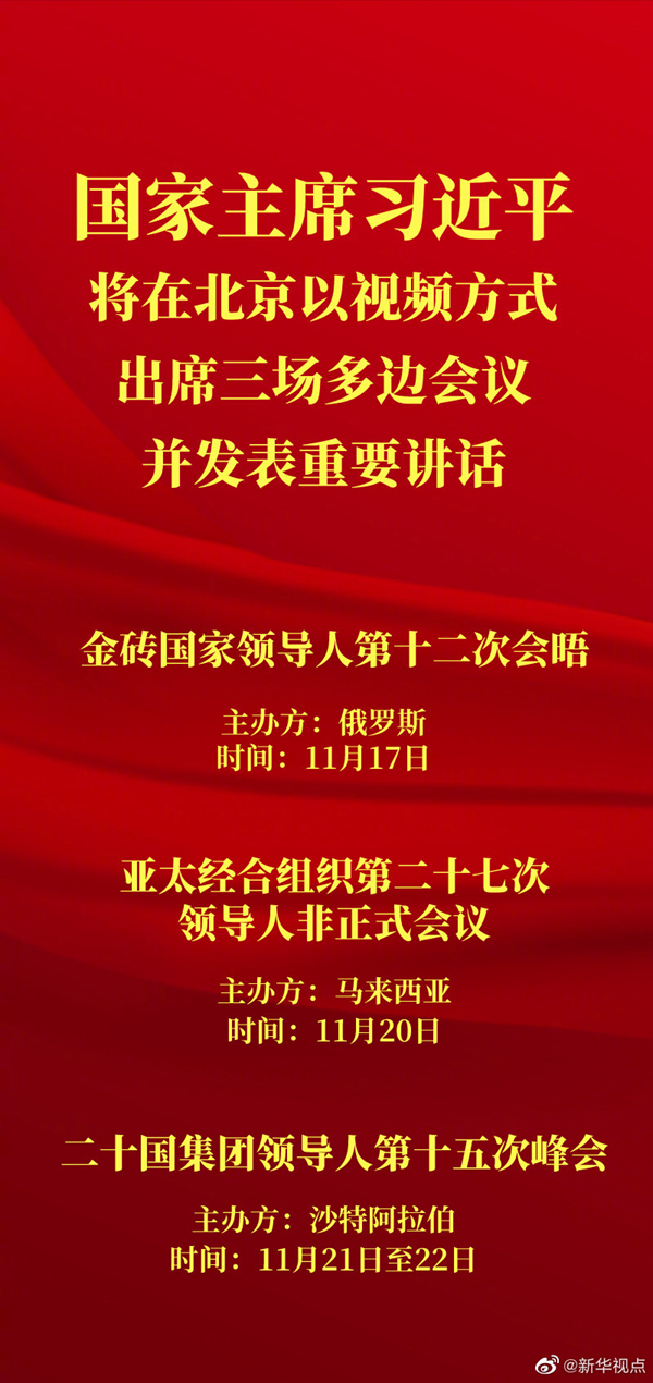 外交部發言人華春瑩12日宣布:應俄羅斯聯邦總統普京邀請,國家主席習近平將于11月17日出席金磚國家領導人第十二次會晤。應馬來西亞總理穆希丁邀請,國家主席習近平將于11月20日出席亞太經合組織第二十七次領導人非正式會議。應沙特阿拉伯王國國王薩勒曼邀請,國家主席習近平將出席11月21日至22日舉行的二十國集團領導人第十五次峰會。上述會議將以視頻方式舉行,習近平主席將在北京出席有關活動并發表重要講話。