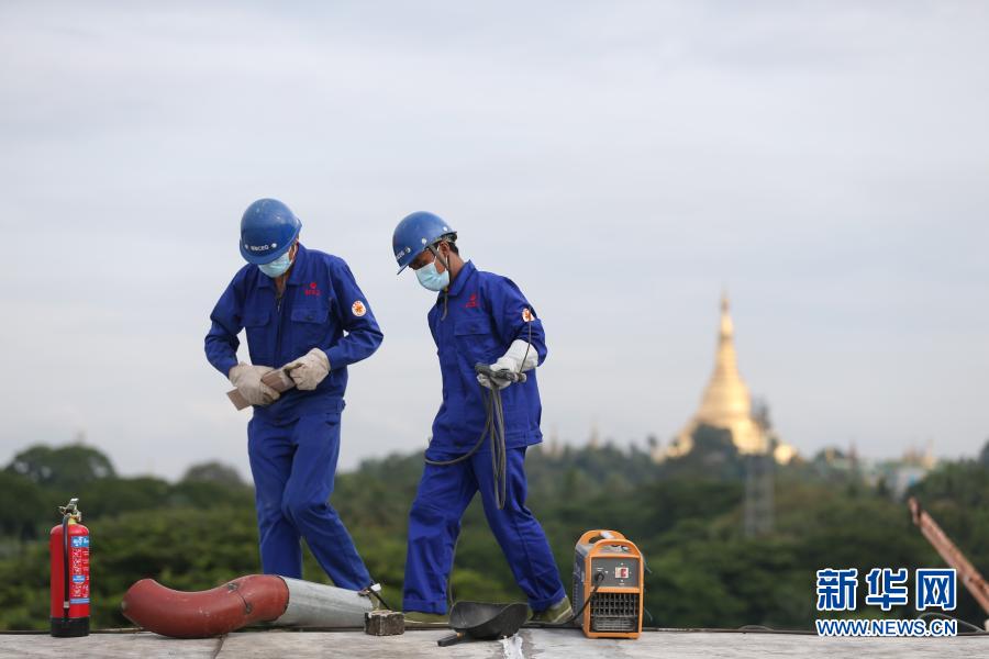 10月28日,在緬甸仰光的國家劇院維修改造項目現場,覺泰昂在師父的指導下焊接鋼管。新華社發(吳昂攝)