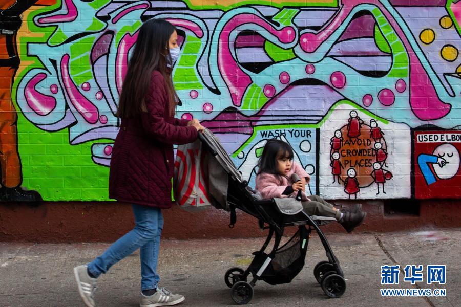 11月21日,在美國紐約,一名女子推著孩子經過抗疫宣傳壁畫。新華社發(郭克 攝)