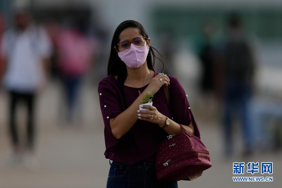 12月16日,在巴西首都巴西利亞,一名女子戴著口罩出行。新華社發(盧西奧·塔沃拉 攝)