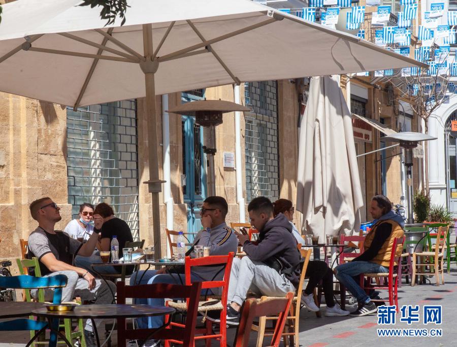 3月16日,人們坐在塞浦路斯首都尼科西亞一家咖啡館的室外區域。