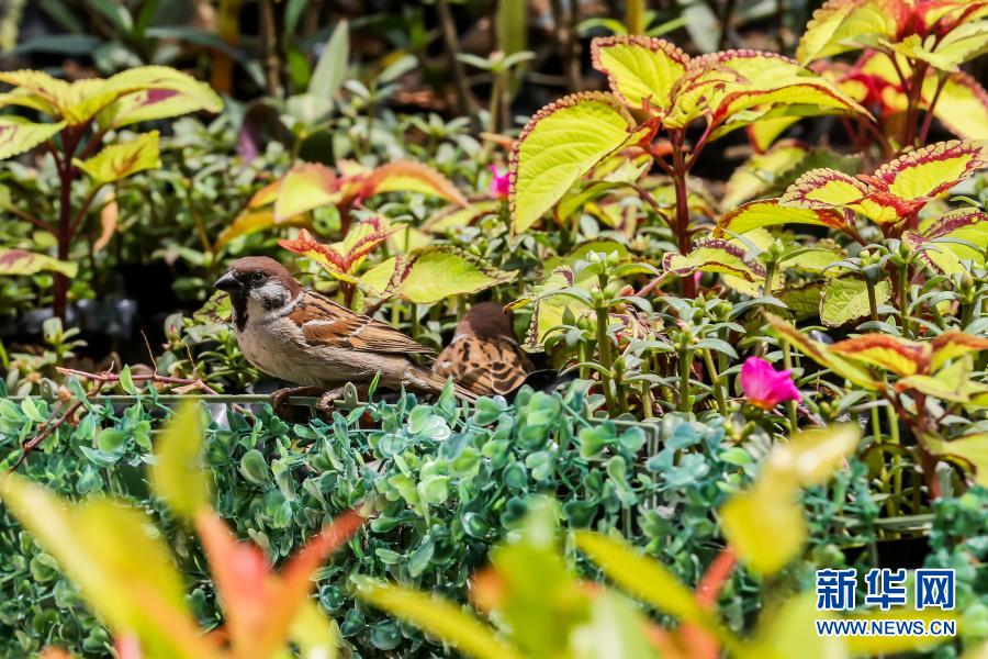 3月18日,在位于馬尼拉的菲律賓大學(xué)附屬菲律賓總醫(yī)院,兩只麻雀站在“低語的花床”藝術(shù)裝置上。