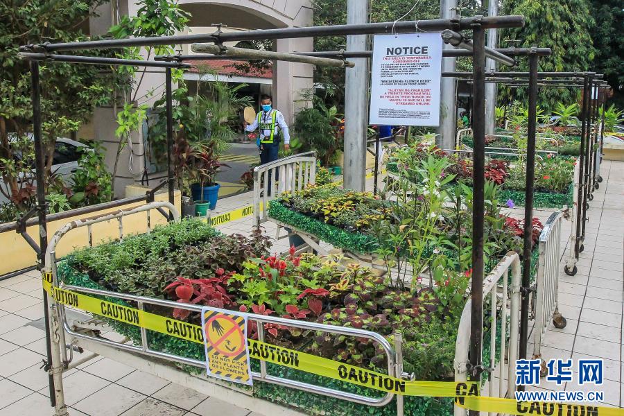 3月18日,在位于馬尼拉的菲律賓大學附屬菲律賓總醫(yī)院,一名安保人員看向“低語的花床”藝術裝置。