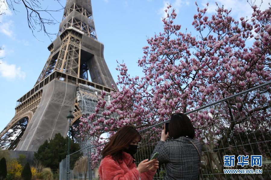 3月19日,在法國巴黎埃菲爾鐵塔腳下的戰神廣場,人們駐足欣賞玉蘭花。新華社記者高靜攝