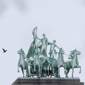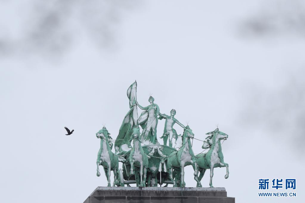 4月7日,比利時布魯塞爾五十周年紀念公園中央拱門上的雕塑被積雪覆蓋。