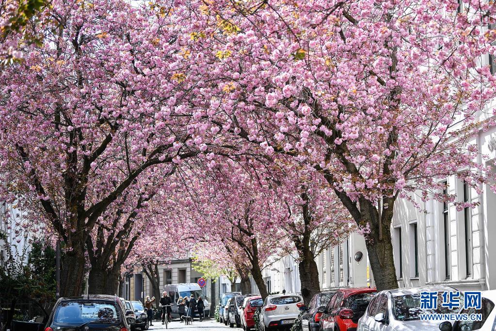 近日,德國西部城市波恩老城區的櫻花盛開,吸引了許多游人前來觀賞。