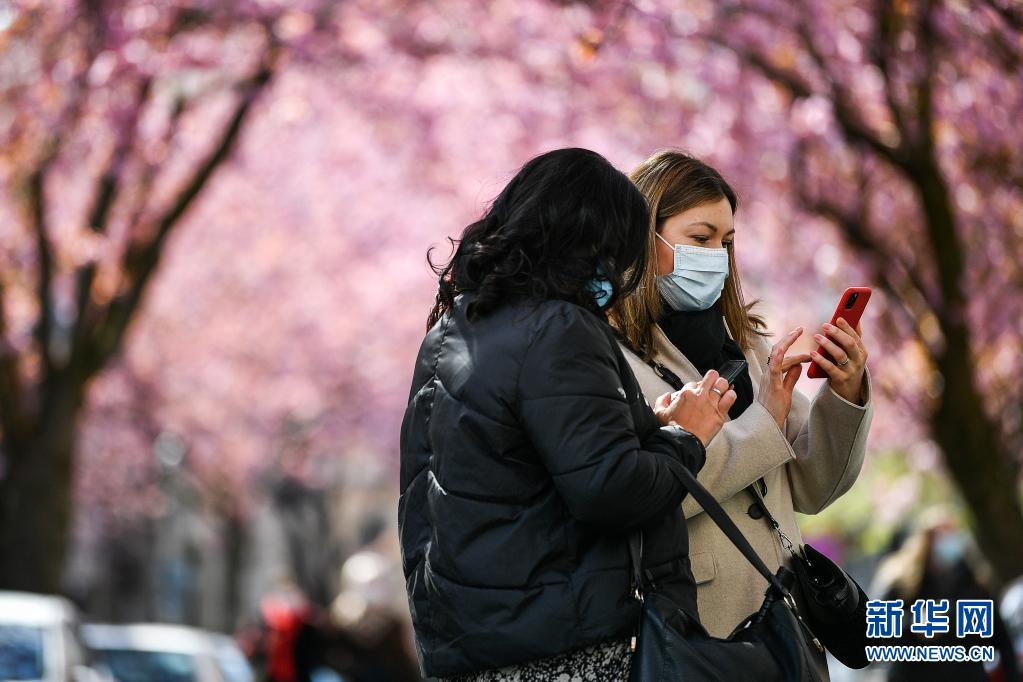 4月13日,兩名游人在德國波恩老城區用手機拍攝盛開的櫻花。