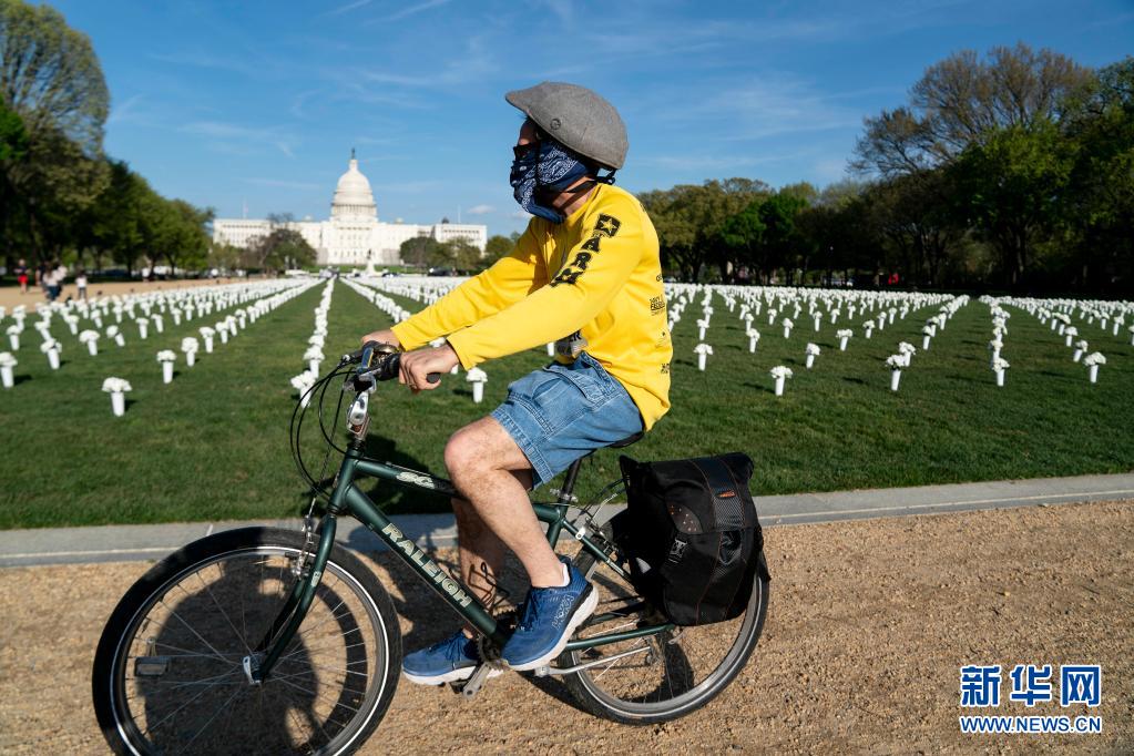 4月13日,一名男子騎車(chē)經(jīng)過(guò)美國(guó)華盛頓國(guó)家廣場(chǎng)草坪上擺放的白色絹花。