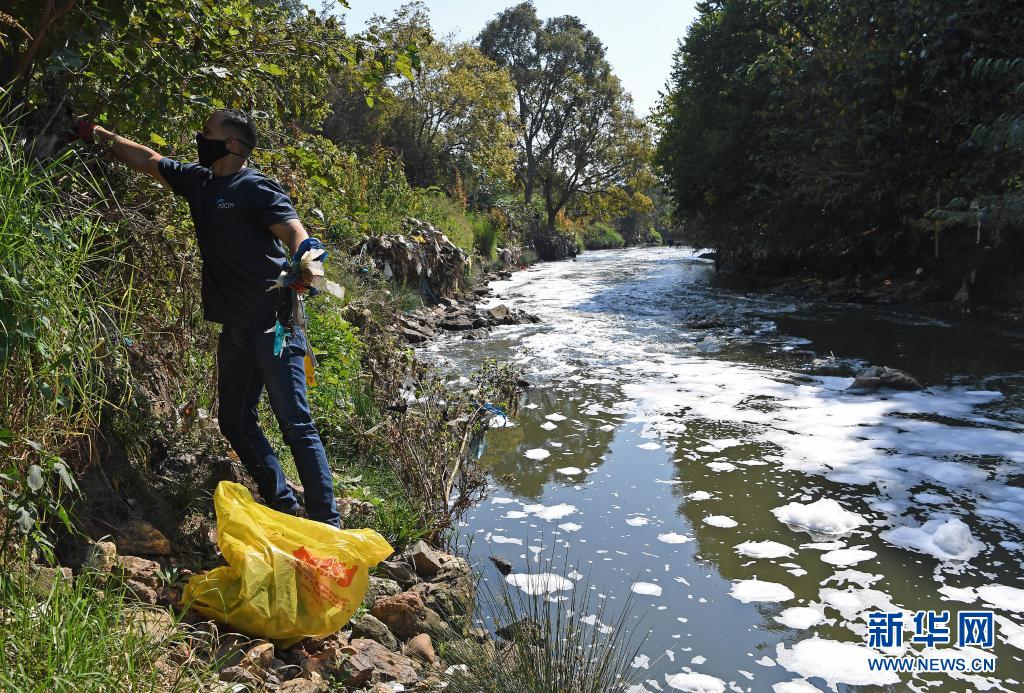 4月22日,南非比勒陀利亞的志愿者在河道邊清理垃圾。