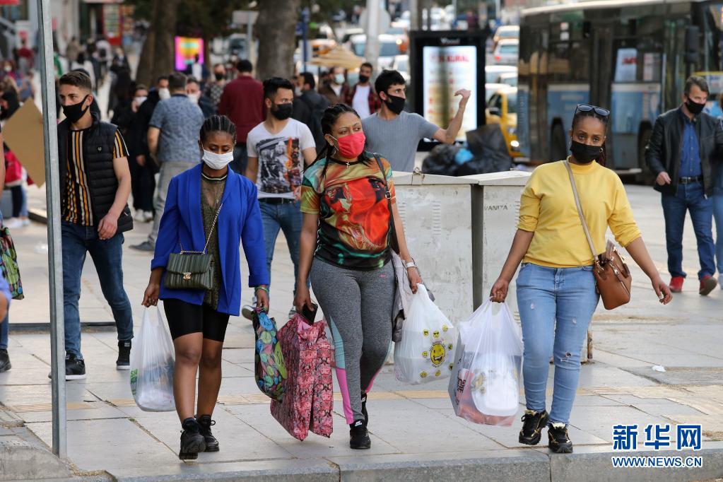 4月29日禁令實(shí)施前,人們戴口罩在土耳其安卡拉購物。