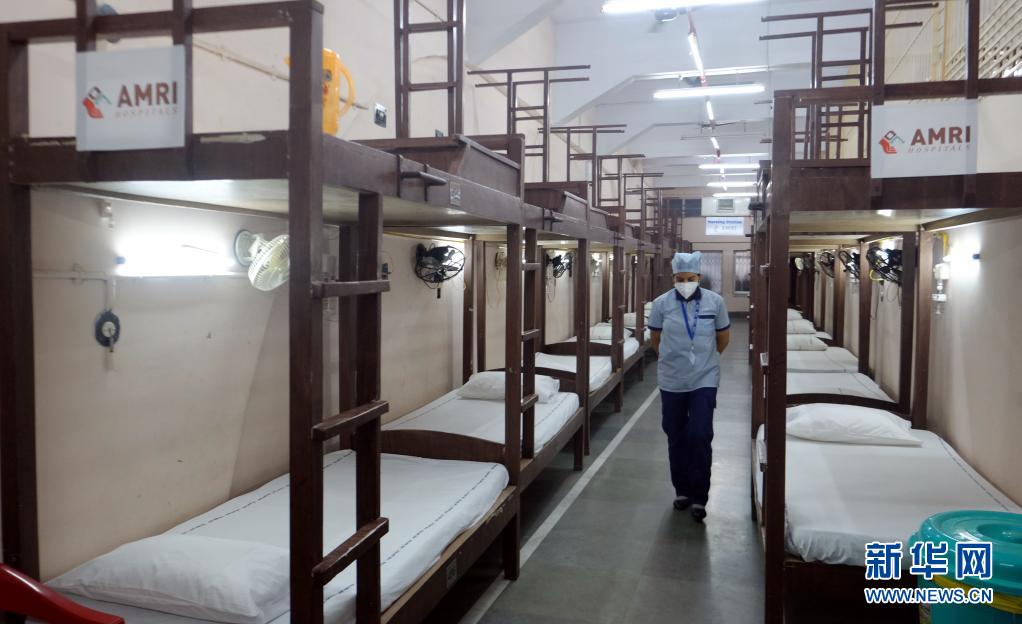 5月6日,工作人員走在印度加爾各答一處被改造成新冠隔離中心的足球場內。