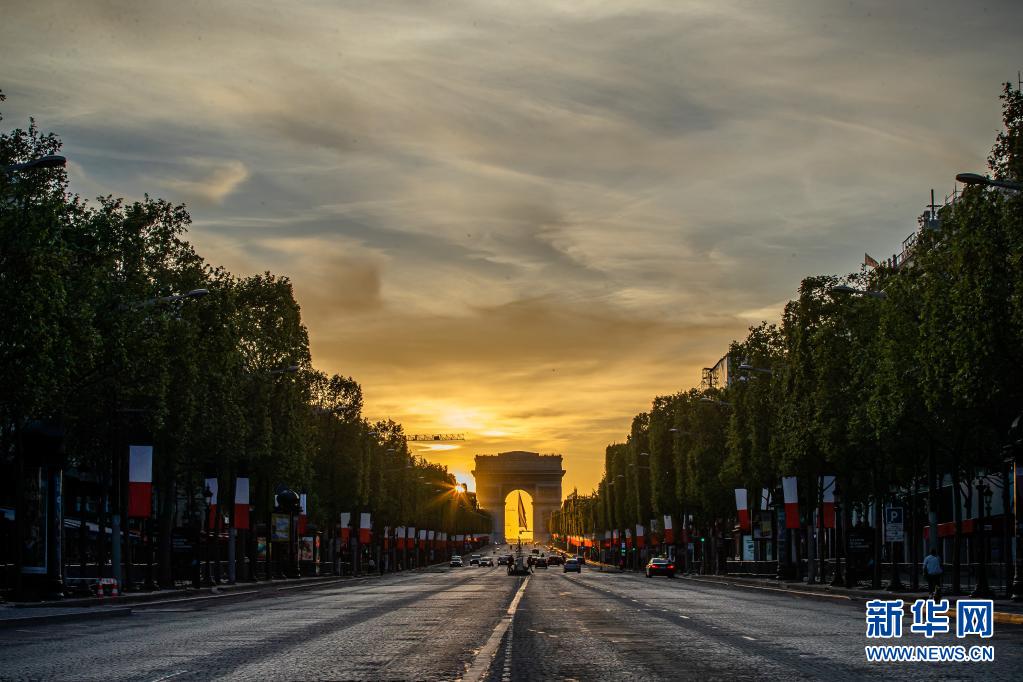 這是5月8日在法國巴黎香榭麗舍大街拍攝的凱旋門落日景象。